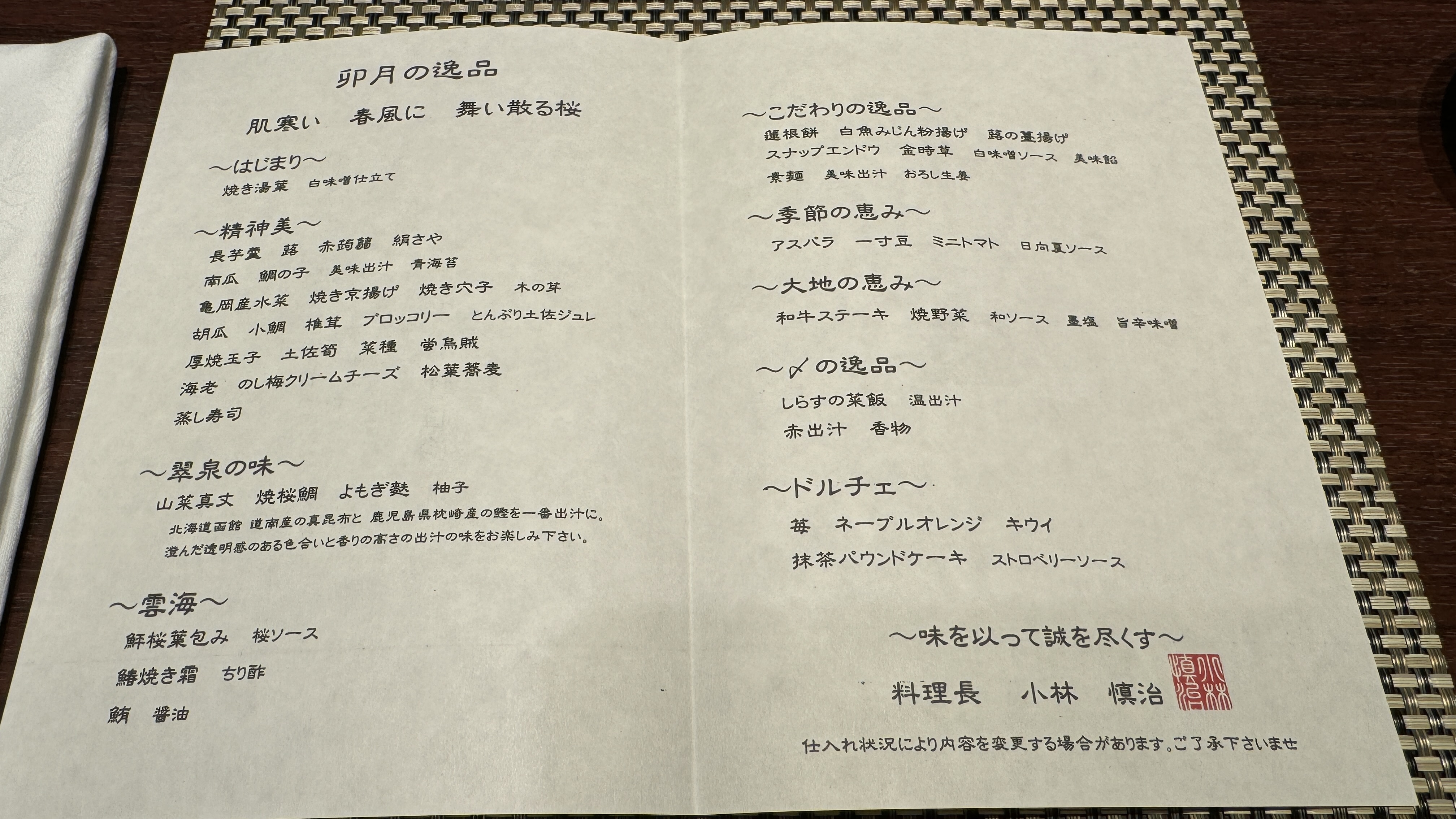 料理長の小林慎治氏の「〜味を持って誠を尽くす〜」という言葉がお品書きに書かれているのですが、一つ一つの料理がとても繊細で誠を尽されているって感じが伝わってくる食事になりました。