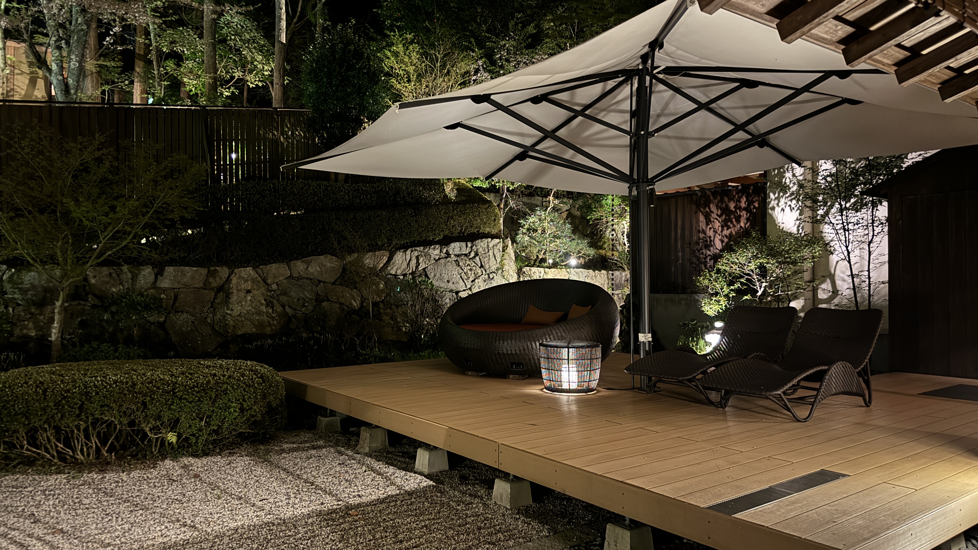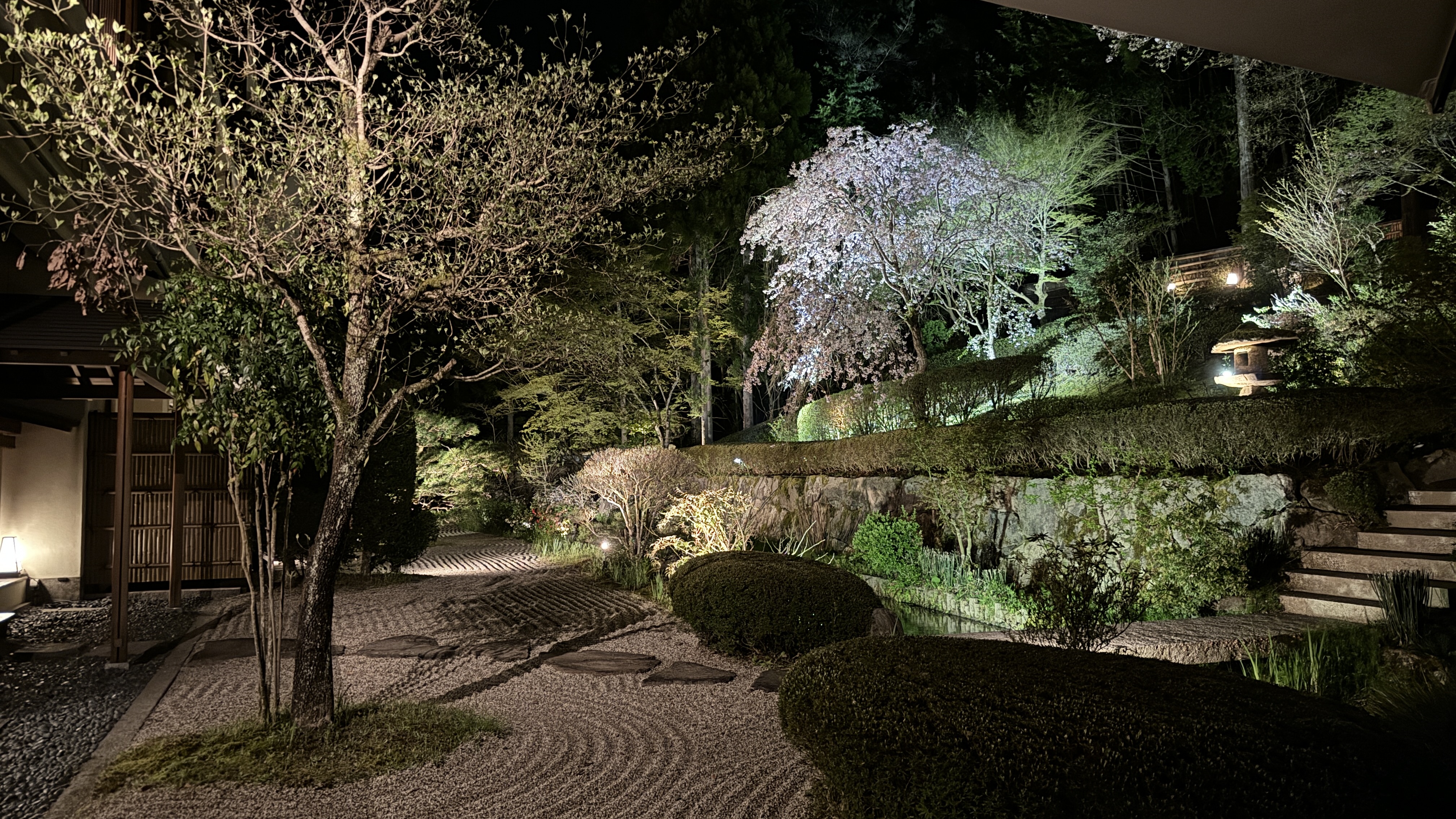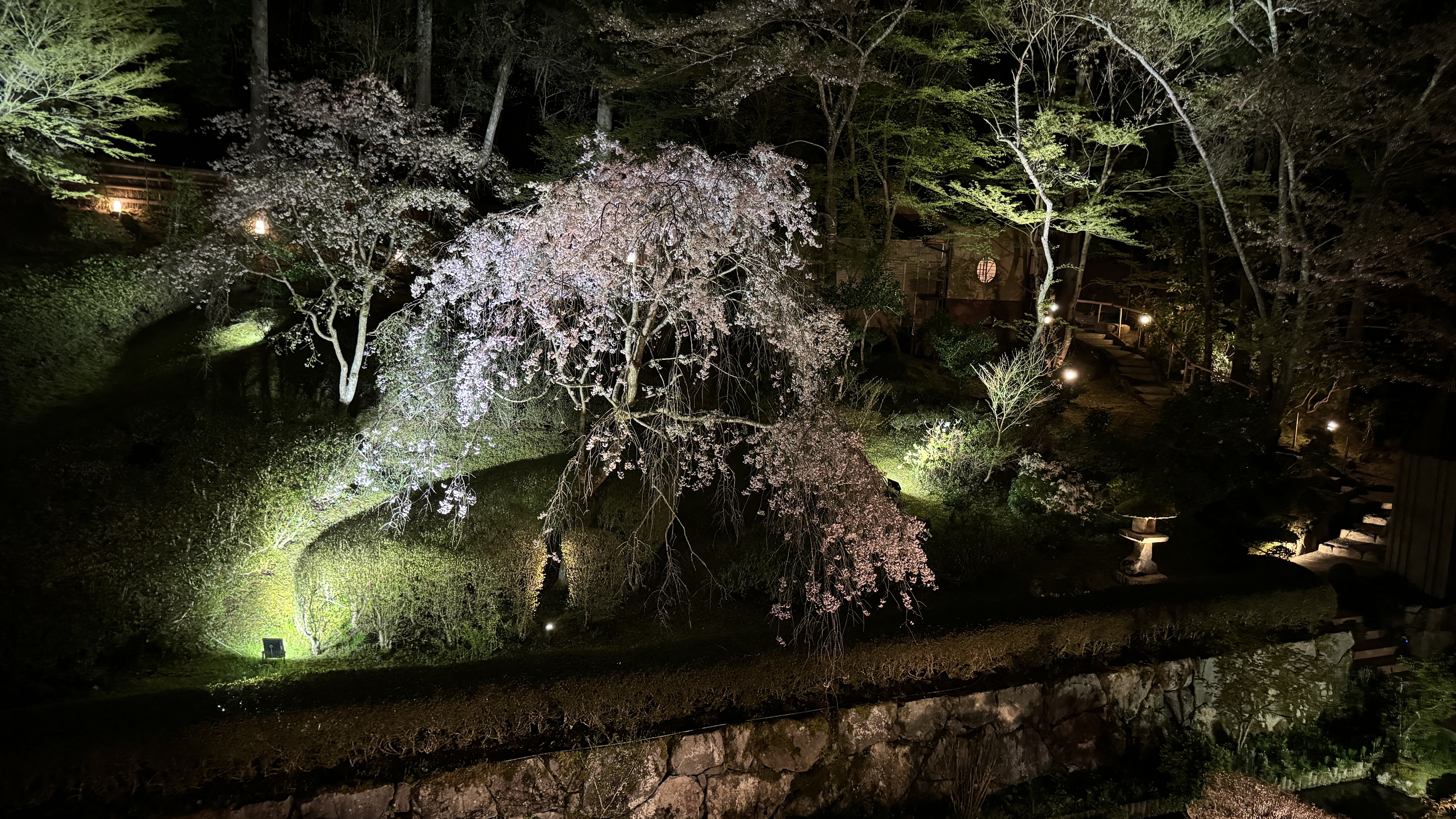 その大浴場のおもてに休憩スペースがあって、ここから夜桜が楽しめました。部屋からの桜と一緒にごらんください。